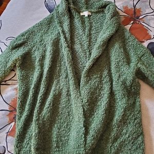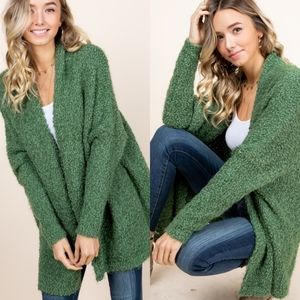 Gorgeous green popcorn cardigan. Thick knit. Super warm and cozy. Dolman sleeves. Oversized. 65% polyester, 35% nylon. Made in the USA.