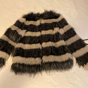 Strut into cooler evenings in this fabulous faux-fur coat. Hook closures. Runs big equivalent to a size medium. Purchased from Macy’s.
