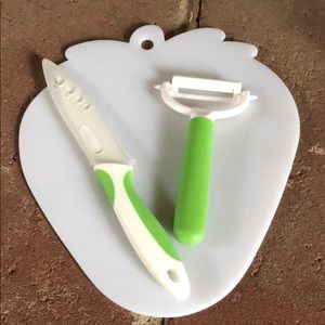 Includes the Apple Shaped Cutting Board, 4” parring knife, and the ceramic vegetable peeler!