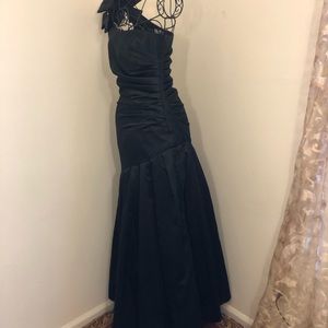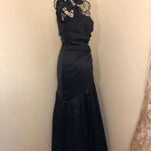 Black , one shoulder formal dress ,rhinestone on it’s shoulder This black evening gown has one embellished shoulder with shiny crystals . Just once has been worn for new year ،formal ،prom, wedding other occasion events .It looks chic and very elegant. It is neat , clean without any tears , damages .