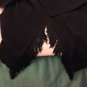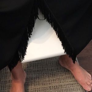 Harve’ Benard - completely lined, formal skirt-suit, with beautiful fringe in front slit of skirt and on each sleeve of jacket. Jacket has one button closure, pockets still sewn closed. Perfect shoulder pads- not too big. Very unusual, and very feminine. Tag says size 16 Tall. But it fits like a loose 12, or a perfect 14. I am 5’7” and weigh 170. The skirt comes to my ankles. Worn once to a formal wedding. This a very high quality two piece outfit. Each piece would be beautiful worn separately.