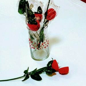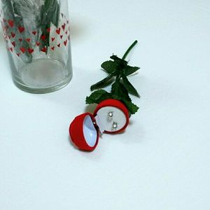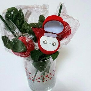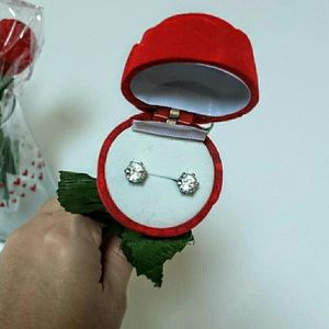 Velvet medium stem roses opens to reveal a pair of approximately 2 carat cubic zirconia QVC quality earrings. Zirconia is flawless compared to real diamonds which are not. Gorgeous red stem rose. Very pretty and shiny. Almost 1 carat per each earring