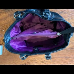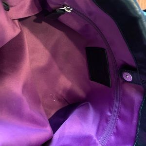 EUC. Black coach purse. Large zipper area in middle. Space on either side. Purple interior. Silver hardware. Slight fraying on one handle (pictured). Small marks under zipper on purple (pictured). Aside from those things, perfect condition.