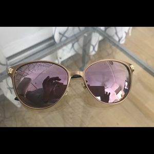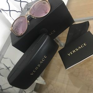 Versace sunglasses. Only worn a few times. No visible signs of wear and tear. Metal frame with plastic temples. Plastic lenses offer 100% UV protection. Clear adjustable nose pads. Iconic Medusa logo at frame. Most complementary face shapes: oval, heart, square. Protective case included. Made in Italy.