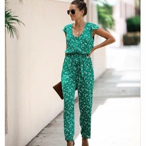 Green floral jumpsuit with tie