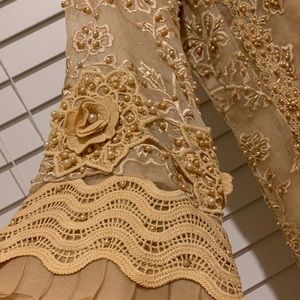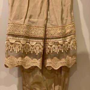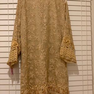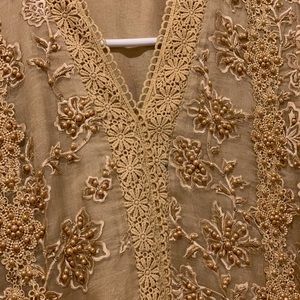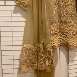Pakistani/ Indian heavy beautiful custom made 3 piece dress Kameez/ Kurta/ Kurti with pants. It has heavy embroidery all over with water pearls and zardozi work. Pants and dupata are beautiful with lace and tissue border. It’s extremely beautiful and unique. I ordered the wrong the size and returning is not an option. It’s a medium size. Perfect for Desi weddings.