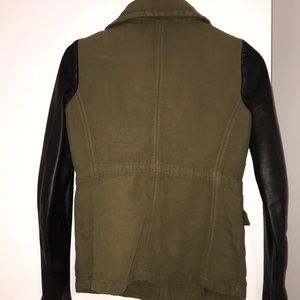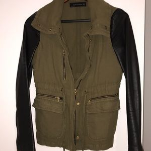 Black leather sleeve and army green color Zara jacket. Sleeves are 100% lamb leather. This is from Zara’s passed collections where they used higher quality goods and materials.