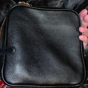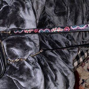 real leather and floral embroidery. this was a christmas gift a few years ago, barley used and it’s discontinued. the leather has no cracks or creases !