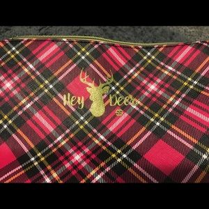 Plaid background. Gold deer head and gold writing that says “Hey Deer”. 9x7. Zip top. No strap. Easy clean material.