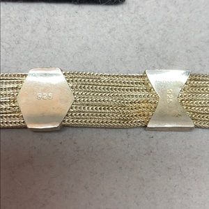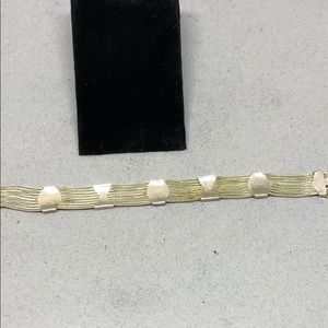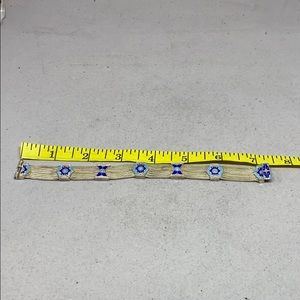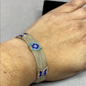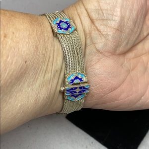 Beautiful Turkish or Byzantine design vintage bracelet with 8 wheat sterling chains and 5 enamel stations (plus closure) in shades of turquoise and royal blue. The bracelet is 1/2” wide. The back of each of the stations are marked 925. Great closure. This is a beautiful vintage piece in very good condition. Minor signs of wear. Bracelet length is 7 1/4”.