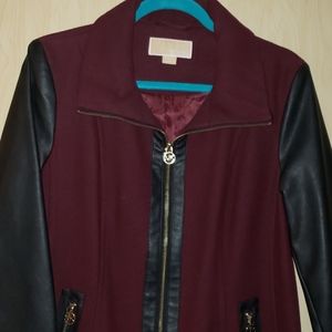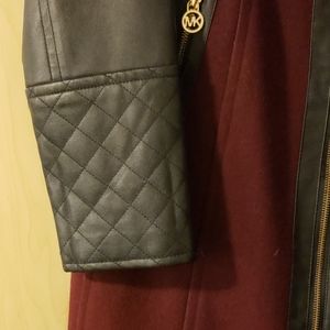 Burgundy wool coat with leather sleeves & gold zipper accents. In excellent condition.