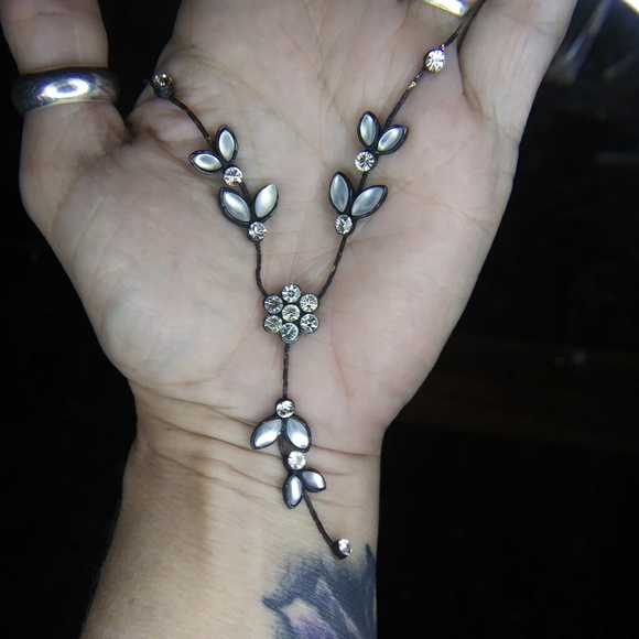 Hard to describe this mother of pearl and Crystal choker the backing of some sort of black gunmetal but the chain is some kind of gold tone the gold seems to be coming off sold as is please see all pics when clasp it's 12 in to the bottom of the crystal the clasp can be adjusted
