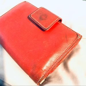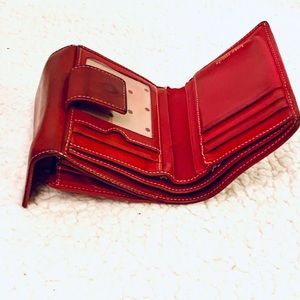 Kate Spade Bifold genuine leather wallet with red and beige interior with red polka dots. Snap front bifold with 4 credit card and 1 ID slot. Snap front coin purse on other side with two slots. Double cash bifold slots and. 3 side slots on sides of credit card slots. Definitely used but in excellent shape. One pen mark on corner and one small seem on inside fold showing its age. Approx 5”4.