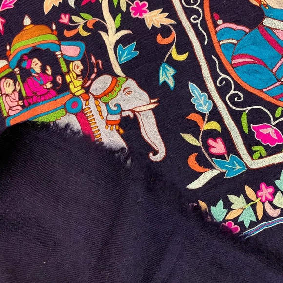 100% pure pashmina. Fully hand Resham (silk) hand embroidery. Mughal theme. Vibrant colors. One of a kind. A piece of art. Took artisans over 11 months to make a single piece in Kashmir.