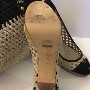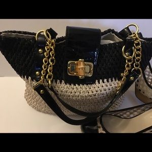 Perfect condition wore one time no stains or markings. Shoes are a size 10M. Purse size is medium., woven material along with the shoes that has a weaving on the side navy patient toe and back heel is 5” with a 1” platform