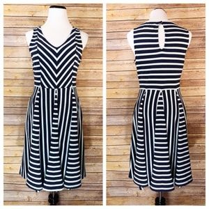 Fun and flirty Anthropologie Saturday Sunday Striped Day Dress! Super cute fit and flare style in a mix of horizontal and vertical stripes in navy blue and a light teal blue, with a scoop neckline and keyhole opening at the back, and two side pockets. In great condition!