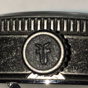 Men's round aged stainless steel case with rotating distressed black bezel, Sapphire crystal with anti-reflective coating, black hand scratched dial with luminous hour markers and cut-out day and date window, Quartz Movement and black genuine FRYE leather strap.