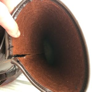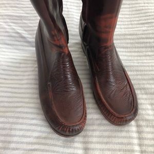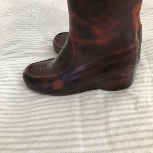 I absolutely adore these timeless boots and was given them by my elderly neighbor probably 12 years ago. She said they were hers from the 60’s or 70’s , but didn’t remember for sure. Unlabeled and made out of a plastic/rubber like material distressed to look like leather. Slight wedge heel. They are insulated and waterproof, but aren’t the best for traction. Size runs like a slim 7. They are built to last for sure!