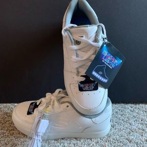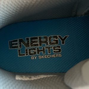 Skechers light up leather sneakers. Energy lights with 5 light capability, includes power charging cord. Enjoy 5-6 hours of continuous lighting on a full charge. Easily accessible off/on switch with a squeeze of the tongue. Super adorable, new in box and perfect condition. Original retail $69