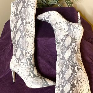 Steve Madden Kinga Natural Snake Multi Tall Boots with a pointed toe, tall shaft and stiletto heel