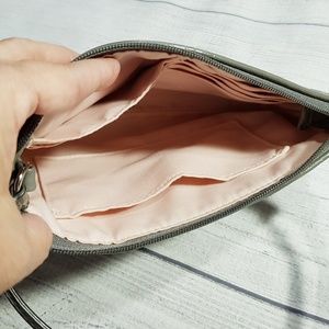 Has small stains at front shown in photo. It has 8 card slots and 1 on the front.