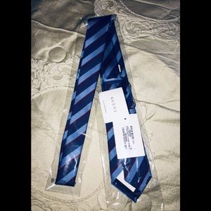 Gucci’s necktie is woven with wide dark blue, light blue and red thin stripes. This intricate style is simple yet classy. The tie is made of woven silk to give it smooth feel. 3"7cm width x 58"/147cm length (approximately). Keeper loop, bar tack and Gucci sewn tag on the underside. Lined. Lining: 93% Silk, 7% Wool. Dry clean. Made in Italy.