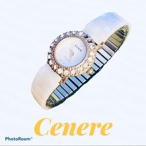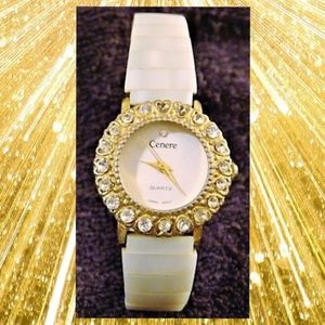 Cenere Rhinestone & Gold Watch with a Pearlized White Stretchable Band. The watch needs a new battery. The watch is missing two rhinestones but still looks nice otherwise the watch is in good condition.