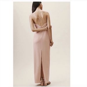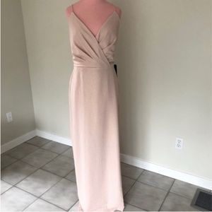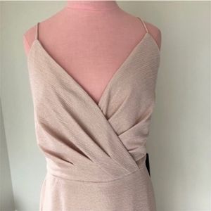 Flecks of gold add a subtle glow to this textured and ultra-stretchy dress. The ruched bodice, strappy open back, and a deep slit complete the oh-so-flattering look.