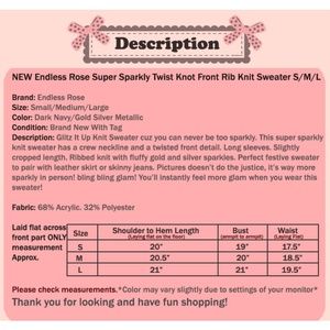 Glitz It Up Knit Sweater cuz you can never be too sparkly. This super sparkly knit sweater has a crew neckline and a twisted front detail. Long sleeves. Slightly cropped length. Ribbed knit with fluffy gold and silver sparkles. Perfect festive sweater to pair with leather skirt or skinny jeans. Pictures doesn’t do the justice, it’s way more sparkly in person! bling bling glam!