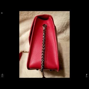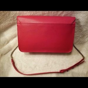 EUC. GHW, smoke free home. Sturdy textured leather exterior, red textile lining, suede feel material on internal flap. Removable, adjustable chain strap w 12”-16” drop and leather break. Rear slide in pocket w magnetic snap closure, 1 int. slip and 1 int zip pocket, 4 feet. EUC; carried a handful of times; minor hairline scratches on feet and front closure. Slight normal marks on int flap from contact w top of bag on int. No odors, stains or other marks. Care card, tag and dust bag included