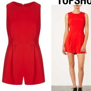 Fun and flirty Topshop red romper with lace details and back zip up closure.