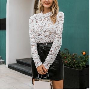 New! Dreamy White Lace Mock Neck Puff Sleeve Top