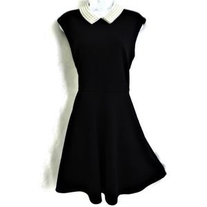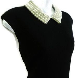 Betsey Johnson. Black A-Line Sleeveless Dress with Large Faux Pearls White Peter Pan Collar. Fit & Flare. Slightly Textured Fabric. Concealed Back YKK Zipper. Worn by Ashley Benson on TV Show Pretty Little Liars. Tagged Size 8.