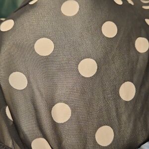 Sheer black button up top with polka dots and front pockets. There are buttons on the sleeves to roll up the arms. Cute piece that can be easily layered!