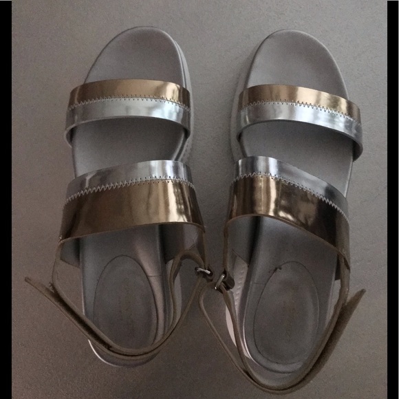 The 2.ZERØGRAND slide sandal integrates craftsmanship w/athletic features that rival top-of-the-line running shoes. Featuring a wide toe box, vamp straps, and an adjustable ankle strap. Smooth leather and metallic leather uppers w/adjustable velcro back strap, fully lined, padded sock lining, full rubber outsole w/concealed Grand.ØS technology for ultimate comfort, 30mm | 1.2 inch platform heel. Good, used condition. Minimal scratches on straps, barely visible. Bottom of rt shoe has ink spot.