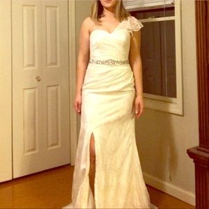 Ruched throughout the middle with a flattering and elegant sweetheart neckline, lace covered buttons, hidden zipper. Some small piling to the fabric and two tiny snags to the lace from wearing a belt with the wedding dress. Please ask any questions before buying, and I’m more than happy to upload more pictures as needed. Only selling as this does not fit me.