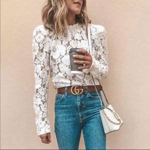 New! Dreamy White Lace Mock Neck Puff Sleeve Top