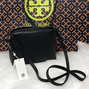 Crossbody strap. Zip closure; lined. Interior zip pocket, interior slip pocket. Side tassel detail and leather logo plaque on front. Leather measurements about