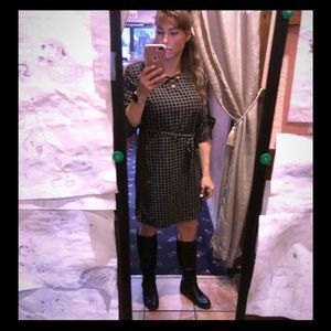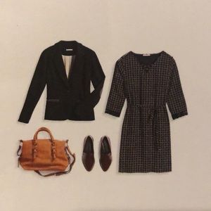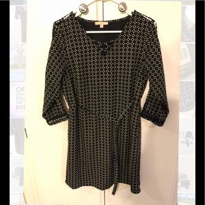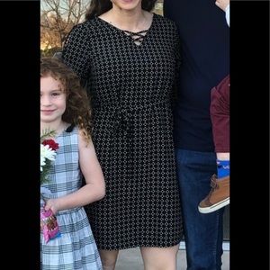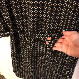 This dress came from Stitch Fix. I have worn it 3-4 times, but now that I’ve been seen (and pictured 😊) in it I’m ready to pass it on. It’s in like new condition, very comfortable and flattering, easy to dress up or down. It has lovely crochet detail on the sleeves and at the wrists. Faux lace up front. It’s a size small - could fit a size 4-8 (I’m a 6) with the elastic waist which ties in the front. Black with tan accents.