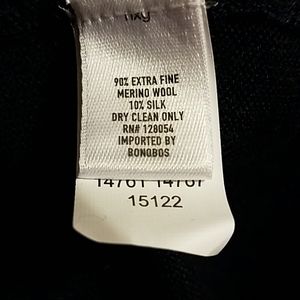Black, Wool/Silk Blend (see tag), round neck, Lightweight, measures approximately 18" pit to pit 27" long .( see inside and outside pictures of 1 small hole near right shoulder)