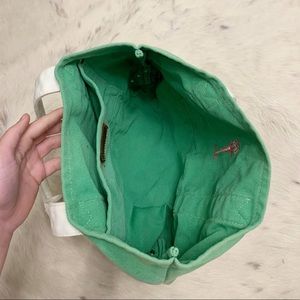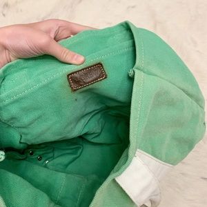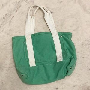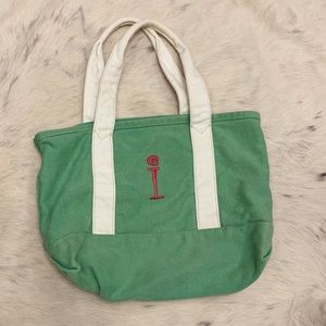 Green canvas JCrew tote. “I” monogrammed in hot pink. Lightly Used...but in good condition! Adorable bag!! Smoke free home.