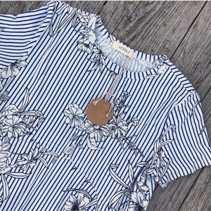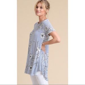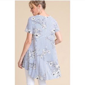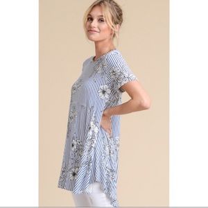 Hopely • Striped Floral Tunic • blue and white striped with hand-drawn black and white floral print • various sizes available • 96 percent rayon & 4 percent spandex