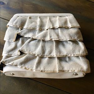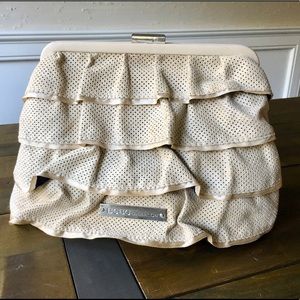This adorable ruffled clutch measures 10x7x3 and is a perfect nude back for all your holiday parties and dinners! EUC almost pristine with no signs of wear on the outside and almost pristine lining as well