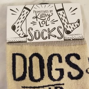 New with tags from Primitives by Kathy LOL. A cream colored sock featuring pictures of dogs and wine bottles with the caption "Dogs And Wine Make Everything Fine" in blues and grays. One size.