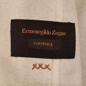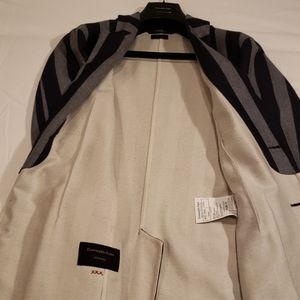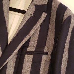 For the self-assured dandy! Luxurious 100% cashmere car coat. Navy and Gray striped. Impeccably tailored by the House of Zegna. Worn once at Milan Mens Fashion Week. Chest underarm 41"