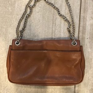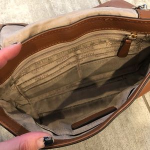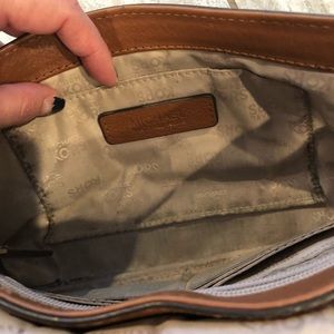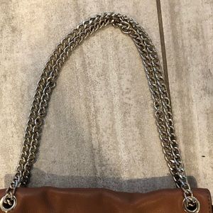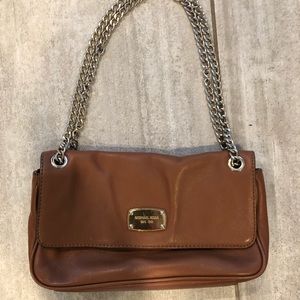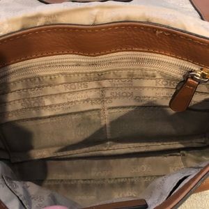 Brown, with metal handle Michael Kors purse. Inside is gentle worn and shows some wear. Please reach out with any questions.