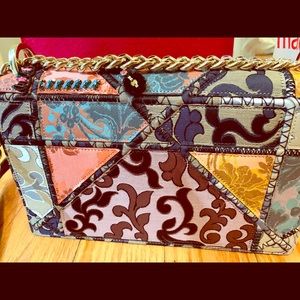 Never used pristine and stunning!!! Gorgeous silk and patterned Taro flap from DIOR with beaded crystal and no Hold back on any kind of detail the silver tone chain has CD initials all through out with Brown goat skin leather handle inside and out. Comes with identification made in Paris absolutely gorgeous! Small