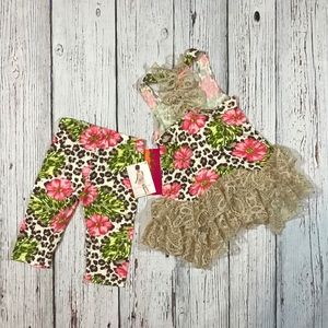 Kate Mack tropical print crop legging and matching printed tunic tank with matching lace detail. New, size 6.
