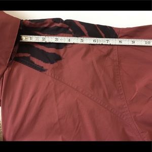 Read ALL :New jacket w tags .size M . It fits woman Sz 10 -12 . Arm pit to arm pit 23”Length 28 “ Lightweight jacket windbreaker, breathable back vent .Full zipper front plus snaps . Hood is retractable .Soft nylon shell , Soft mesh lining . Running Or casual jacket . wear it summer / spring / fall as casual or rain jacket . It’s made from recycled materials .jacket is red with a touch of rust brown- photos 6-9 . photos 1-5 it looks a bit lighter color. Last photo shows price by other sellers