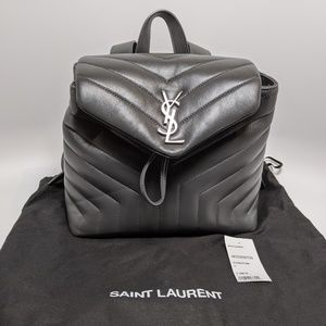 Features: Classic, softly constructed flap front backpack with adjustable flat leather straps, metal interlocking YSL signature, metal and leather chain strap and "Y" matelasse stitching.